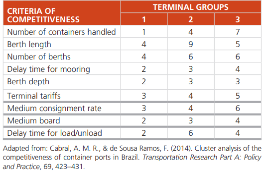 Brazilâs fast-growing economy has been largely dependent on its freight transport capacity. A recent study has categorized the countryâs containership sea port terminals into three distinct groups based on the competitiveness criteria (listed in the table below), and their scores against the competitiveness criteria (scores between 1 and 10, with 10 being the highest score):