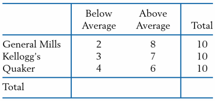 Breakfast cereals from three leading manufacturers can be classified either above average or below average in sugar content. Data for ten cereals from each manufacturer are given below: