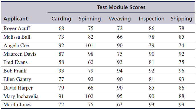 Brenda Last is the personnel director at the Burlingham Textile Company. The companyâs plant is expanding, and Brenda must fill five new supervisory positions in carding, spinning, weaving, inspection, and shipping. Applicants for the positions are required to take a written psychological and aptitude test. The test has different modules that indicate an applicantâs aptitude and suitability for a specific area and position. For example, one module tests the psychological traits and intellectual skills that are best suited for the inspection department, which are different from the traits and skills required in shipping. Brenda has had 10 applicants for the five positions and has compiled the results from the test. The test scores for each position module for each applicant (where the higher the score, the better) are as follows: