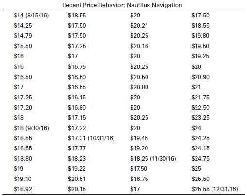 Recent Price Behavior: Nautilus Navigation $14 (8/15/16) $18.55 $20 $17.50 $14.25 $17.50 $20.21 $18.55 $14.79 $17.50 $20.25 $19.80 $15.50 $17.25 $20.16 $19.50 $16 $17 $20 $19.25 $16 $16.75 $20.25 $20 $16.50 $16.50 $20.50 $20.90 $17 $16.55 $20.80 $21 $17.25 $16.15 $20 $21.75 $17.20 $16.80 $20 $22.50 $18 $17.15 $20.25 $23.25 $18 (9/30/16) $17.22 $20 $24 $18.55 $17.31 (10/31/16) $19.45 $24.25 $18.65 $17.77 $19.20 $24.15 $18.80 $18.23 $18.25 (11/30/16) $24.75 $19 $19.22 $17.50 $25 $19.10 $20.51 $16.75 $25.50 $18.92 $20.15 $17 $25.55 (12/31/16)