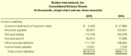 Brinker International operates Chiliâs, Macaroni Grill, and other restaurant chains. The following items are classified as current liabilities on Brinker Internationalâs balance sheets as of 2015 and 2014: