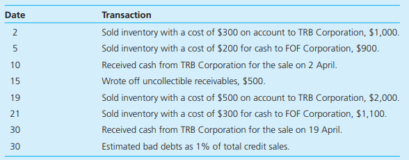 Date Transaction Sold inventory with a cost of $300 on account to TRB Corporation, $1,000. Sold inventory with a cost of $200 for cash to FOF Corporation, $900. 10 Received cash from TRB Corporation for the sale on 2 April. 15 Wrote off uncollectible receivables, $500. 19 Sold inventory with a cost of $500 on account to TRB Corporation, $2,000. 21 Sold inventory with a cost of $300 for cash to FOF Corporation, $1,100. 30 Received cash from TRB Corporation for the sale on 19 April. 30 Estimated bad debts as 1% of total credit sales. 2.