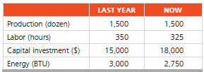 LAST YEAR NOW Production (dozen) 1,500 1,500 Labor (hours) 350 325 Capital investment ($) 15,000 18,000 Energy (BTU) 3,000 2,750