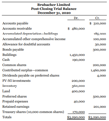 Brubacher Limited Post-Closing Trial Balance December 31, 2020 Dr. Cr. Accounts payable $ 310,000 Accounts receivable $ 480,000 Aceumulated depreciation-buildings 185,000 Accumulated other comprehensive income 100,000 Allowance for doubtful accounts 30,000 Bonds payable 300,000 Buildings 1,450,000 Cash 190,000 Common shares 200,000 Contributed surplus-common 1,460,000 Dividends payable on preferred shares 4,000 FV-NI investments 200,000 Inventory Land 360,000 400,000 Preferred shares 500,000 Prepaid expenses Retained earnings 40,000 201,000 Treasury shares (10,000 common shares) 170,000 Totals $3,290,000 $3,290,000 Common Preferred Authorized 600,000 60,000 Issued 200,000 10,000 Outstanding 190,000 10,000