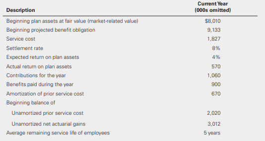 c. Reconcile the ending balance in accumulated other comprehensive income and indicate the amounts attributable to unamortized prior service cost and unamortized net actuarial gains/losses. d. Prepare the journal entry to record the current yearâs pension cost.