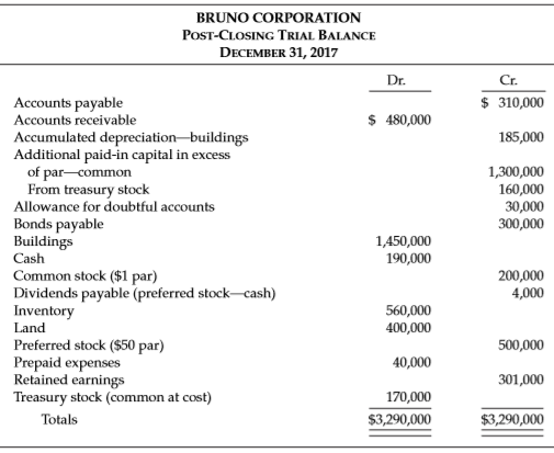 BRUNO CORPORATION POST-CLOSING TRIAL BALANCE DECEMBER 31, 2017 Dr. Cr. $ 310,000 Accounts payable Accounts receivable Accumulated depreciation-buildings Additional paid-in capital in excess of par-common From treasury stock Allowance for doubtful accounts Bonds payable Buildings $ 480,000 185,000 1,300,000 160,000 30,000 300,000 1,450,000 190,000 Cash Common stock ($1 par) Dividends payable (preferred stock-cash) Inventory Land 200,000 4,000 560,000 400,000 Preferred stock ($50 par) Prepaid expenses Retained earnings Treasury stock (common at cost) 500,000 40,000 301,000 170,000 Totals $3,290,000 $3,290,000 Common 600,000 200,000 190,000 Preferred Authorized 60,000 10,000 10,000 Issued Outstanding