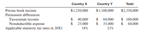 Bryan is also listed on the New York Stock Exchange (NYSE). Therefore, Bryan is registered as a âforeign private issuerâ with the U.S. Securities and Exchange Commission and mustfile financial statements with the SEC in accordance with SEC regulations for foreign privateissuers. These regulations permit Bryan to file its IFRS financial statements with the SEC, butit has decided to prepare U.S. GAAP financial statements as well for the convenience of its U.S. shareholders. With respect to the reconciliation of the statutory tax rate to the effective tax rate in theincome tax note disclosure, SEC regulations for foreign private issuers permit them to reconcile to either the relevant statutory income tax rate in their country of domicile or to anotherapplicable tax rate. Reconciling to the statutory income tax rate in its country of domicilewould be comparable to a U.S. company reconciling to the U.S. federal tax rate. Bryan carefully selected its accounting policies under IFRS and U.S. GAAP so that, in 20X1, it reported the same pre-tax book income in both the U.S. GAAP and IFRS financialstatements. Therefore, the only difference between the tax rate reconciliation in the U.S. GAAPfinancial statements and the IFRS financial statements is due to the use of a country-specificstatutory tax rate (statutory tax rate in Country X) or a weighted-average statutory tax rate(another applicable tax rate) as the beginning point of the reconciliation. The table below presents Bryanâs pre-tax book income and the applicable statutory tax ratesin each country and permanent differences between taxable and book income in the two countries in which Bryan operates. Bryan has no temporary differences in 20X1.