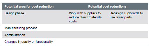 Potential area for cost reduction Design phase Manufacturing process Administration Changes in quality or functionality Potential cost reductions Work with suppliers to reduce direct materials costs Redesign cupboards to use fewer parts