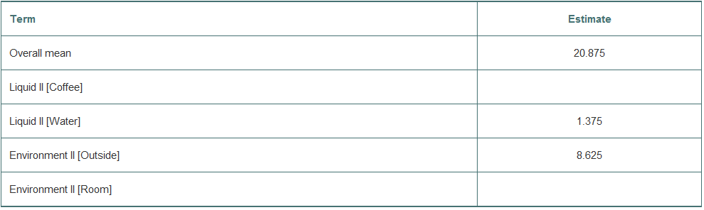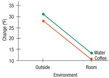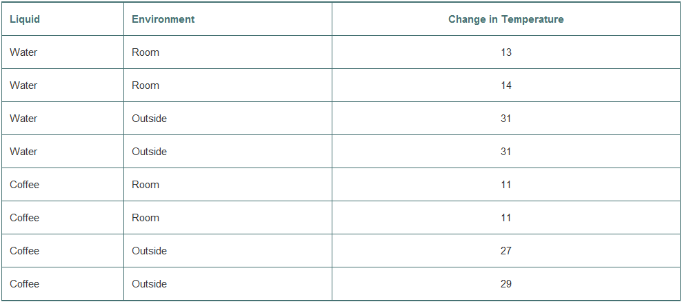 Building on the cup experiment of the Chapter 4 Step-By-Step, a student selects one type of container and designs an experiment to see whether the type of Liquid stored and the outside Environment affect the ability of a cup to maintain temperature. He randomly chooses an experimental condition and runs each twice: