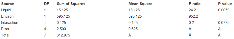 > A student experiment was run to test the performance of 4 brands of batteries under 2 different Environments (room temperature and cold). For each of the 8 treatments, 2 batteries of a particular brand were put into a flashlight. The flashlight was then