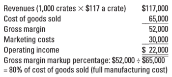 Revenues (1,000 crates × $117 a crate) Cost of goods sold Gross margin Marketing costs Operating income Gross margin markup percentage: $52,000 ÷ $65,000 = 80% of cost of goods sold (full manufacturing cost) $117,000 65,000 52,000 30,000 $ 22,000 Variable $35,000 17,000 Fixed Manufacturing Marketing $30,000 13,000