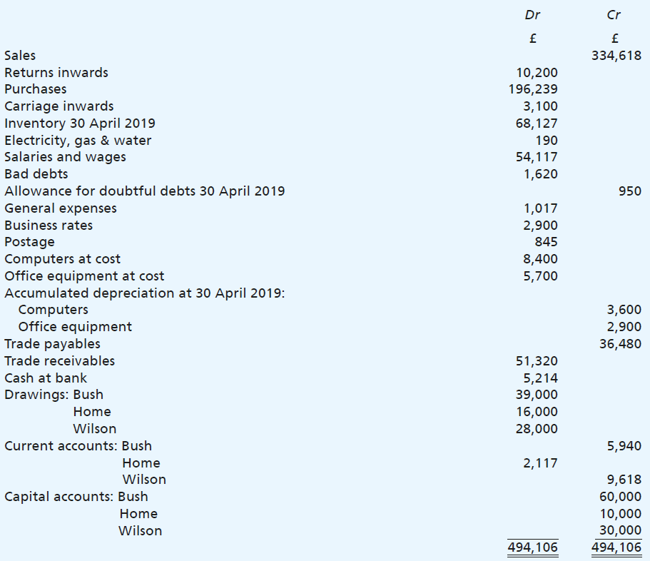 Bush, Home and Wilson share profits and losses in the ratios 4:1:3 respectively. Their trial balance as at 30 April 2020 was as follows: