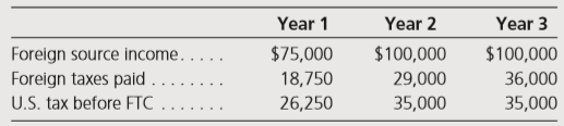 Year 1 Year 2 Year 3 Foreign source income... Foreign taxes paid... $75,000 $100,000 $100,000 18,750 26,250 29,000 36,000 U.S. tax before FTC 35,000 35,000