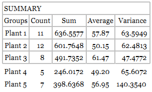 Business is very good for a chemical company. In fact, it is so good that workers are averaging more than 40 hours per week at each of the chemical companyâs five plants. However, management is not certain whether there is a difference between the five plants in the average number of hours worked per week per worker. Random samples of data are taken at each of the five plants. The data are analyzed using Excel. The results follow. Explain the design of the study and determine whether there is an overall significant difference between the means at α = .05. Why or why not? What are the values of the means? What are the business implications of this study to the chemical company?