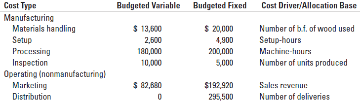 Butler uses activity-based costing and has classified all overhead costs as shown in the following table. Budgeted fixed overhead costs vary with capacity. Butler operates at capacity so budgeted fixed overhead cost per unit equals the budgeted fixed overhead costs divided by the budgeted quantities of the cost allocation base.