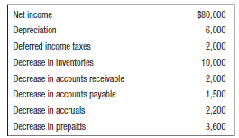 Net Income S80,000 Depreciation 6,000 Deferred income taxes 2,000 Decrease in inventories 10,000 Decrease in accounts receivable 2,000 Decrease in accounts payable 1,500 Decrease in accruals 2,200 Decrease in prepaids 3,600