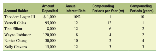 Annual Compounding Periods per Year (m) Amount Compounding Periods (years) Account Holder Deposited Interest Rate Theodore Logan III $ 1,000 10% 1 10 Vernell Coles 95,000 12 12 1 Tina Elliott 8,000 12 2 Wayne Robinson Eunice Chung 120,000 8 4 2 30,000 10 2 4 Kelly Cravens 15,000 12 3 3