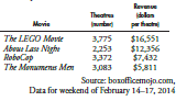 Reven The unbe dolan Movia peh The LEGO Movte 3,775 2,253 3372 3,083 $16,551 Abeus Lasu Nighe RoboCap The Meramens Mon $12.356 $7,432 $5,811 Source: bosofficemoja.com, Data for weekend of February 14-17, 2014
