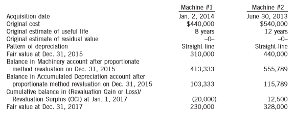 Machine #1 Machine #2 Acquisition date Original cost Original estimate of useful life Original estimate of residual value Pattern of depreciation Jan. 2, 2014 $440,000 8 years 0- June 30, 2013 $540,000 12 years -0- Straight-line 310,000 Straight-line 440,000 Fair value at Dec. 31, 2015 Balance in Machinery account after proportionate 413,333 method revaluation on Dec. 31, 2015 Balance in Accumulated Depreciation account after proportionate method revaluation on Dec. 31, 2015 Cumulative balance in (Revaluation Gain or Loss)/ Revaluation Surplus (OCI) at Jan. 1, 2017 Fair value at Dec. 31, 2017 555,789 103,333 115,789 (20,000) 230,000 12,500 328,000