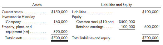 Assets Liabilities and Equity Current assets $150,000 Liabilities. $100,000 Investment in Hinckley Company Property, plant, and equipment (net) . Equity: Common stock ($10 par) $500,000 Retained earnings..... 160,000 100,000 600,000 390,000 $700,000 Total liabilities and equity Total assets.. $700,000 Income Dividends Paid $ 10,000 25,000 $ 5,000 5,000 2012 2013 Income Dividends Paid 2014 40,000 35,000 5,000 5,000 2015. Total. $110,000 $20,000
