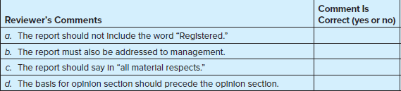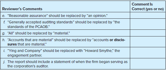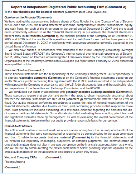 Report of Independent Registered Public Accounting Firm (Comment a) To the shareholders and the board of directors (Comment b) of Casa Royale, Inc. Oplnion on the Financial Statements We have audited the accompanying balance sheets of Casa Royale, Inc. (the "Company) as of Decem- ber 31, 20X7 and 20X6, the related statements of Income, comprehensive Income, stockholders' equity. and cash flows, for each of the three years In the perlod ended December 31, 20X7, and the related notes (collectively referred to as the "financlal statements"). In our opinion, the flnanclal statements present falrly, In all respects (Comment c), the financlal position of the Company as of December 31, 20X7 and 20X6, and the results of Its operations and its cash flows for each of the three years in the perlod ended December 31, 20X7, In conformity with accounting principles generally accepted In the United States of America We also have audited, In accordance with standards of the Public Company Accounting Oversight Board (United States) ("PCAOB") the Company's Internal control over financial reporting as of Decem- ber 31, 20X7, based on Internal Control-Integrated Framework Issued by the Committee of Sponsoring Organizatlons of the Treadway Commisslon (COSO) and our report dated February 12, 20X8 expressed an unqualifled opinion. Basis for Opinion (Comment d) These financlal statements are the responsibility of the Company's management. Our responsibility Is to express reasonable assurance (Comment e) on the Company's financlal statements based on our audits. We are a public accounting filrm registered with the PCAOB and are requlred to be Independent with respect to the Company In accordance with the U.S. federal securitles laws and the applicable rules and regulations of the Securitles and Exchange Commisslon and the PCAOB. We conducted our audits In accordance with generally accepted auditing standards (Comment f). Those standards require that we plan and perform the audit to obtaln reasonable assurance about whether the financlal statements are free of all (Comment g) misstatement, whether due to error or fraud. Our audits Included performing procedures to assess the risks of materlal misstatement of the financlal statements, whether due to error or fraud, and performing procedures that respond to those risks. Such procedures Included examining, on a test basis, evidence regarding the amounts and dis- closures In the financlal statements. Our audits also Indluded evaluating the accounting prindples used and significant estimates made by management, as well as evaluating the overall presentation of the financlal statements. We belleve that our audits provide a reasonable basis for our opinlon. Critical Audit Matters The critical audit matters communicated below are matters arlsing from the current perlod audit of the financlal statements that were communicated or required to be communicated to the audit committee and that (1) relate to accounts that are materlal (Comment h) to the financial statements and (2) Involved our especlally challenging, subjective, or complex Judgments. The communication of critical audit matters does not alter In any way our opinilon on the financial statements, taken as a whole, and we are not, by communicating the critical audit matters below, providing separate opinlons on the critical audit matters or on the accounts or disclosures to which they relate. Ying and Company CPAS (Comment /) Phoenlx Arizona (Comment) Comment Is Reviewer's Comments Correct (yes or no) a. The report should not Include the word "Registered." b. The report must also be addressed to management. c. The report should say In "all materlal respects." d. The basis for opinion sectlon should precede the oplnlon sectlon. Comment Is Reviewer's Comments Correct (yes or no) e. "Reasonable assurance" should be replaced by "an oplnlon." f. "Generally accepted auditing standards" should be replaced by "the standards of the PCAOB." g. "All" should be replaced by "materlal." h. "Accounts that are materlal" should be replaced by "accounts or disclo- sures that are materlal." I. "Ying and Company" should be replaced with "Howard Smythe," the engagement partner. J. The report should Include a statement of when the firm began serving as the corporatlon's auditor.