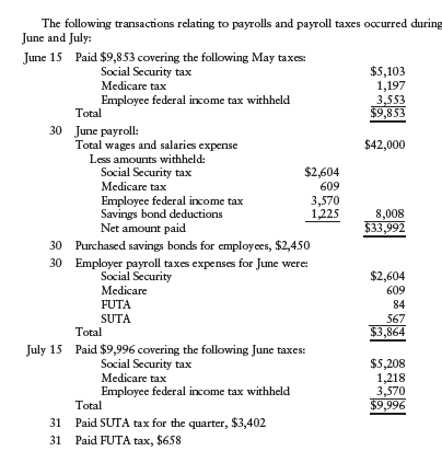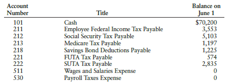 Account Number Balance on Title Cash Employee Federal Income Tax Payable Social Security Tax Payable Medicare Tax Payable Savings Bond Deductions Payable FUTA Tax Payable SUTA Tax Payable Wages and Salaries Expense Payroll Taxes Expense June 1 $70,200 3,553 5,103 1,197 1,225 574 101 211 212 213 218 221 222 2,835 511 530 The following transactions relating to payrolls and payroll taxes occurred during June and July: June 15 Paid $9,853 covering the following May taxes: Social Security tax Medicare tax $5,103 1,197 3,553 $9,853 Employee federal income tax withheld Total 30 June payroll: Total wages and salaries expense Less amounts withheld: $42,000 Social Security tax Medicare tax $2,604 609 Employee federal income tax Savings bond deductions Net amount paid 3,570 1,225 8,008 $33,992 30 Purchased savings bonds for employees, $2,450 30 Employer payroll taxes expenses for June were: Social Security $2,604 Medicare 609 FUTA 84 SUTA 567 Total $3,864 July 15 Paid $9,996 covering the following June taxes: Social Security tax Medicare tax Employee federal income tax withheld $5,208 1,218 3,570 $9,996 Total 31 Paid SUTA tax for the quarter, $3,402 31 Paid FUTA tax, $658