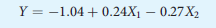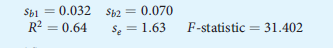 Y = -1.04 + 0.24X1 – 0.27X2 0.032 S62 0.070 %3D R? = 0.64 Se = 1.63 F-statistic = 31.402
