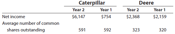 a. Determine the earnings per share in Year 2 and Year 1 for each company. Neither Caterpillar nor Deere have any preferred stock outstanding. Round to the nearest cent.
