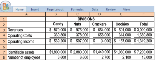 Cathy Carpenter, controller of the Sweet and Salty Snacks is preparing a presentation to senior executives about the performance of its four divisions. Summary data related to the four divisions for the most recent year are as follows: