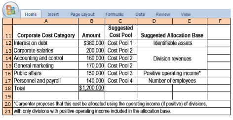 Home Insert Page Layout Formulas Data Review View A B D E 1 DIVISIONS Candy $ 870,000 $ 975,000 $ 654,000 $ 501,000 $ 3,000,000 330,800 $ 539,200 $ 597,000 $ (4,000) $ 187,000 $ 1,319,200 Nuts Crackers Cookies Total 3 Revenues 4 Operating Costs 5 Operating Income 378,000 658,000 314,000 1,680,800 7 Identifiable assets 8 Number of employees $1,800,000 $ 2,880,000 $1,440,000 $1,080,000| $ 7,200,000 2,700 3,600 6,600 2,100 15,000 Page Layout B Home Insert Formulas Data Review View A D E F 11 Corporate Cost Category Amount 12 Interest on debt 13 Corporate salaries 14 Accounting and control 15 General marketing 16 Public affairs 17 Personnel and payroll Suggested Cost Pool $380,000 Cost Pool 1 200,000 Cost Pool 2 160,000 Cost Pool 2 170,000 Cost Pool 2 150,000 Cost Pool 3 140,000 Cost Pool 4 $1,200,000 Suggested Allocation Base Identifiable assets Division revenues Positive operating income Number of employees 18 Total 19 20 "Carpenter proposes that this cost be allocated using the operating income (if positive) of divisians, 21 with only divisions with positive operating income included in the allocation base.