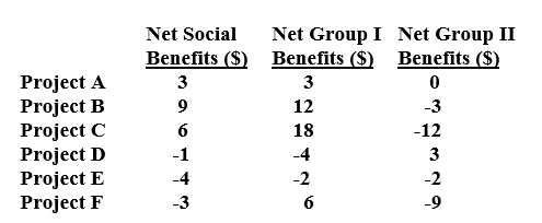 Net Social Net Group I Net Group II Benefits ($) Benefits ($) Benefits ($) Project A Project B Project C Project D Project E Project F 3 3 12 -3 6 18 -12 -1 -4 3 -4 -2 -2 -3 6 -9