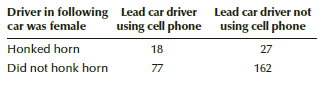Driver in following Lead car driver Lead car driver not car was female using cell phone using cell phone Honked horn 18 27 Did not honk horn 77 162