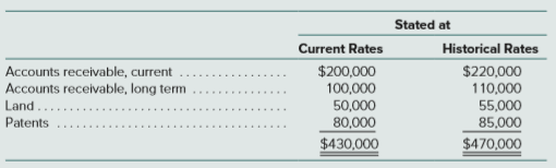 Stated at Current Rates Historical Rates $200,000 100,000 50,000 80,000 $430,000 $220,000 110,000 55,000 Accounts receivable, current Accounts receivable, long term Land. Patents 85,000 $470,000
