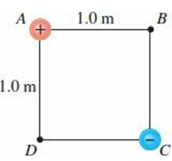 Charges of +2.0 nC and â1.0 nC are located at opposite corners, A and C, respectively, of a square which is 1.0 m on a side. What is the electric potential at a third corner, B, of the square (where there is no charge)?