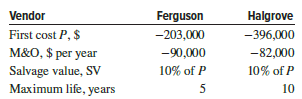 Charlieâs Truck Repair and Service has a new contract that requires him to purchase and maintain new equipment for work on 18-wheeler trucks and heavy road equipment. Two separate vendors have made quotes and estimates for Charlie. Use the estimates and a 6% per year return requirement to find the better economic option. One problem is that Charlie does not currently know if the contract will last for 5, 8, or 10 years. He needs a recommendation for all three time periods.