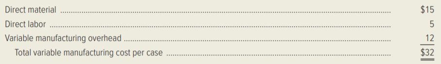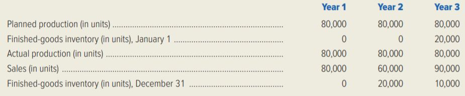 Variable selling and administrative costs amount to $1 per case. Budgeted fixed manufacturing overhead is $800,000 per year, and fixed selling and administrative cost is $75,000 per year. The following data pertain to the companyâs first three years of operation.