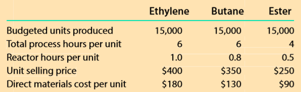 Ethylene Butane Ester Budgeted units produced Total process hours per unit Reactor hours per unit Unit selling price Direct materials cost per unit 15,000 15,000 15,000 4 1.0 0.8 0.5 $400 $350 $250 $180 $130 $90