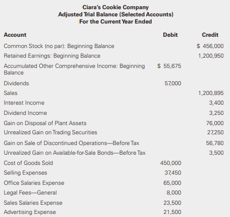 > Ciara’s Cookie Company provided the following account balances from its year-end trial balance. During the year, Ciara issued no-par common stock. The proceeds of the new issue were $25,000. The company is subject to a 40% income tax r