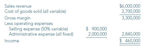 $6,000,000 2,700,000 Sales revenue Cost of goods sold (all variable) Gross margin Less operating expenses Selling expense (50% variable) Administrative expense (all fixed) 3,300,000 $ 900,000 2,000,000 2,840,000 Income $ 460,000