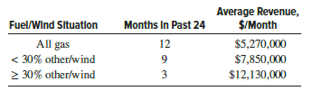 CINESA, a government-owned power company that normally uses natural gas for electricity generation, is purchasing fuels other than natural gas and power from a commercially built wind farm, often at extra costs, which are transferred to the customer. Total monthly fuel and wind-power costs are now averaging $6,800,000. An engineer with the utility has calculated the average revenue for the past 24 months using three fuel-mix and wind-power situations: all gas,