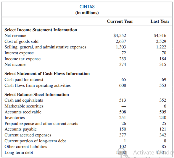 CINTAS (in millions) Current Year Last Year Select Income Statement Information Net revenue $4,552 $4,316 Cost of goods sold Selling, general, and administrative expenses Interest expense Income tax expense 2,637 2,529 1,303 1,222 72 70 233 184 Net income 374 315 Select Statement of Cash Flows Information Cash paid for interest Cash flows from operating activities 65 69 608 553 Select Balance Sheet Information Cash and equivalents 513 352 Marketable securities 6 Accounts receivable 508 505 Inventories 251 240 26 Prepaid expense and other current assets Accounts payable Current accrued expenses Current portion of long-term debt 25 150 121 377 342 1 8 Other current liabilities 102 85 Long-term debt 1,300 Activate V301do