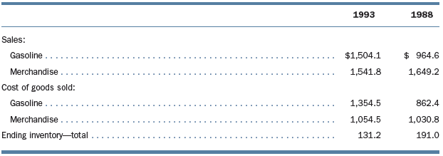 Gasoline Merchandise Sales... $1,562.5 million $1,710.3 million Cost of goods sold 1,372.1 million 1,192.6 million End-of-year inventory . 26.6 million 93.9 million 1993 1988 Sales: Gasoline $1,504.1 $ 964.6 Merchandise 1,541.8 1,649.2 Cost of goods sold: Gasoline . 1,354.5 862.4 Merchandise 1,054.5 1,030.8 Ending inventorytotal 131.2 191.0