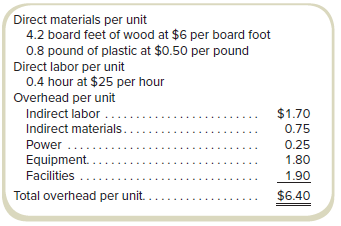 Direct labor costs per hour are expected to rise by 5 percent this year. Wood prices are expected to remain unchanged, but plastic prices are expected to decrease by 8 percent. A new production method, which will be put into use at the beginning of the coming year, will result in a reduction of the wood required to produce a unit by 3 percent. No other costs are expected to change.