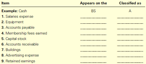 Item Appears on the Classified as Example: Cash 1. Salaries expense BS A 2. Equipment 3. Accounts payable 4. Membership fees earned 5. Capital stock 6. Accounts receivable 7. Buildings 8. Advertising expense 9. Retained earnings