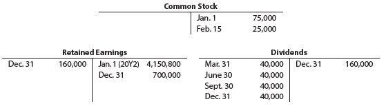 Common Stock Jan. 1 75,000 Feb. 15 25,000 Retained Earnings Dividends Dec. 31 160,000 Jan. 1 (20Y2) 4,150,800 Mar. 31 40,000 Dec. 31 160,000 Dec. 31 700,000 June 30 40,000 Sept. 30 Dec. 31 40,000 40,000