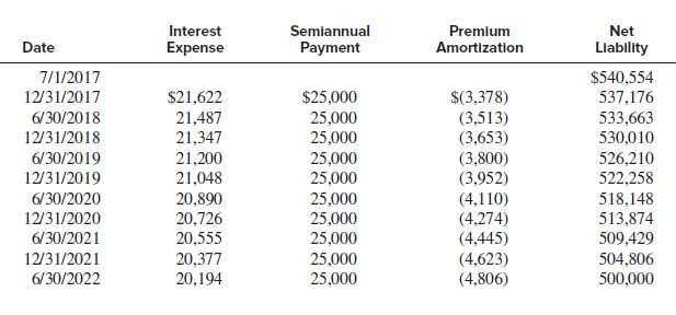 Interest Semlannual Premlum Net Date Expense Payment Amortization Llability 7/1/2017 $540,554 537,176 12/31/2017 $21,622 21,487 21,347 $25,000 25,000 25,000 $(3,378) (3,513) (3,653) 6/30/2018 533,663 530,010 12/31/2018 (3,800) (3,952) (4,110) (4,274) (4,445) (4,623) (4,806) 6/30/2019 12/31/2019 21,200 21,048 20,890 20,726 20,555 20,377 20,194 25,000 25,000 25,000 25,000 25,000 25,000 25,000 526,210 522,258 6/30/2020 518,148 513,874 509,429 12/31/2020 6/30/2021 12/31/2021 504,806 500,000 6/30/2022