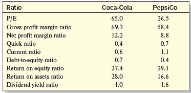 Coca-Cola and PepsiCo are well-known international beverage and snack companies. Compare the two companies as a potential investment based on the following ratios: