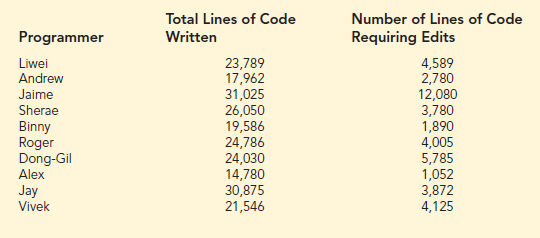 Code Churn is a common metric used to measure the efficiency and productivity of software engineers and computer programmers. Itâs usually measured as the percentage of a programmerâs code that must be edited over a short period of time. Programmers with higher rates of code churn must rewrite code more often because of errors and inefficient programming techniques. The following table displays sample information for 10 computer programmers.