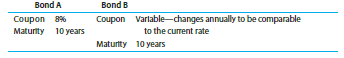 Bond A Bond B Coupon 8% Coupon Varlable-changes annually to be comparable Maturity 10 years to the current rate Maturity 10 years