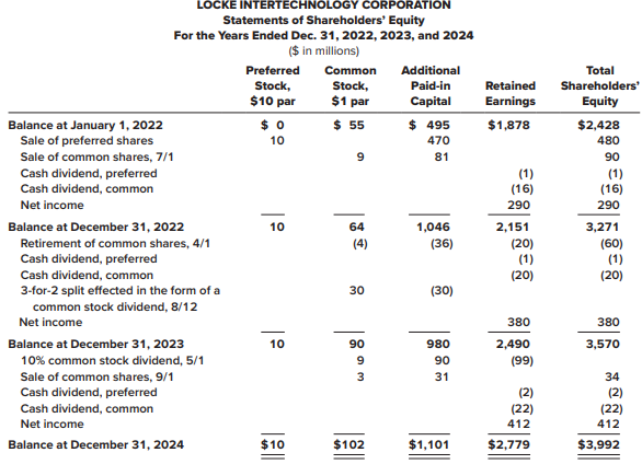 Infer from the statements the events and transactions that affected Locke Inter technology Corporationâs shareholdersâ equity and compute earnings per share as it would have appeared on the income statements for the years ended December 31, 2022, 2023, and 2024. No potential common shares were outstanding during any of the periods shown.